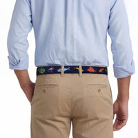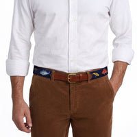 Flat view of Needlepoint Monogrammed Fish and Tackle Belt Dark Navy with brown leather trim and a brass buckle
